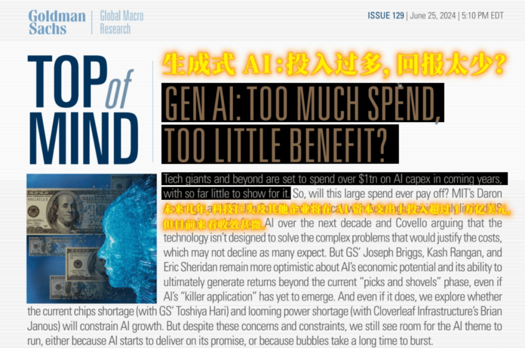 高盛甚至发布过一份 30 多页报告,核心观点就是“AI 投入巨大,收益有限”。